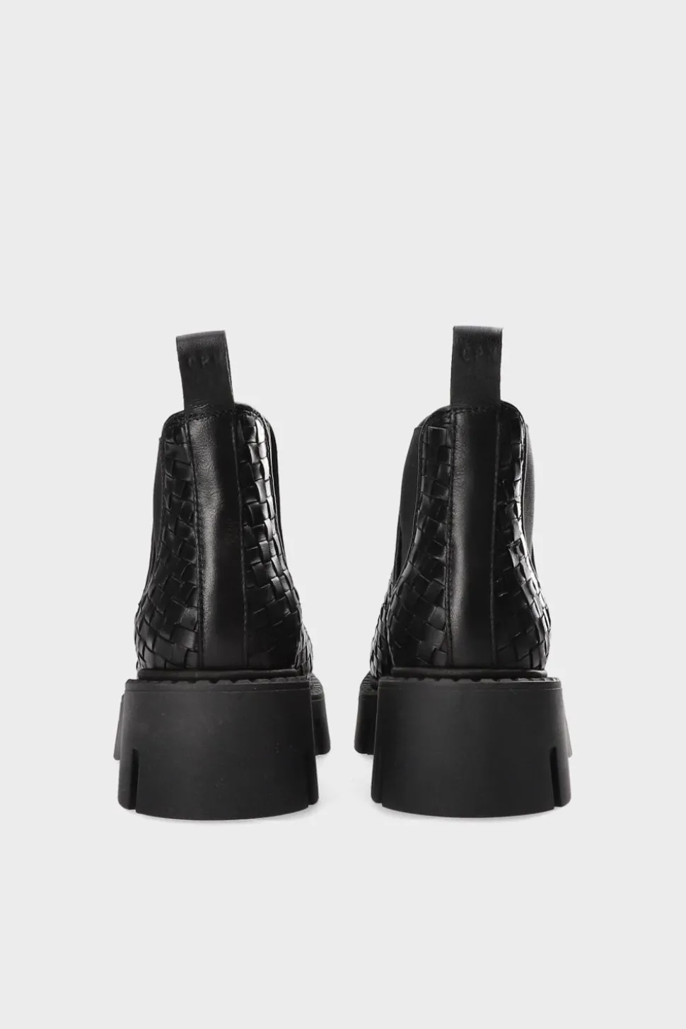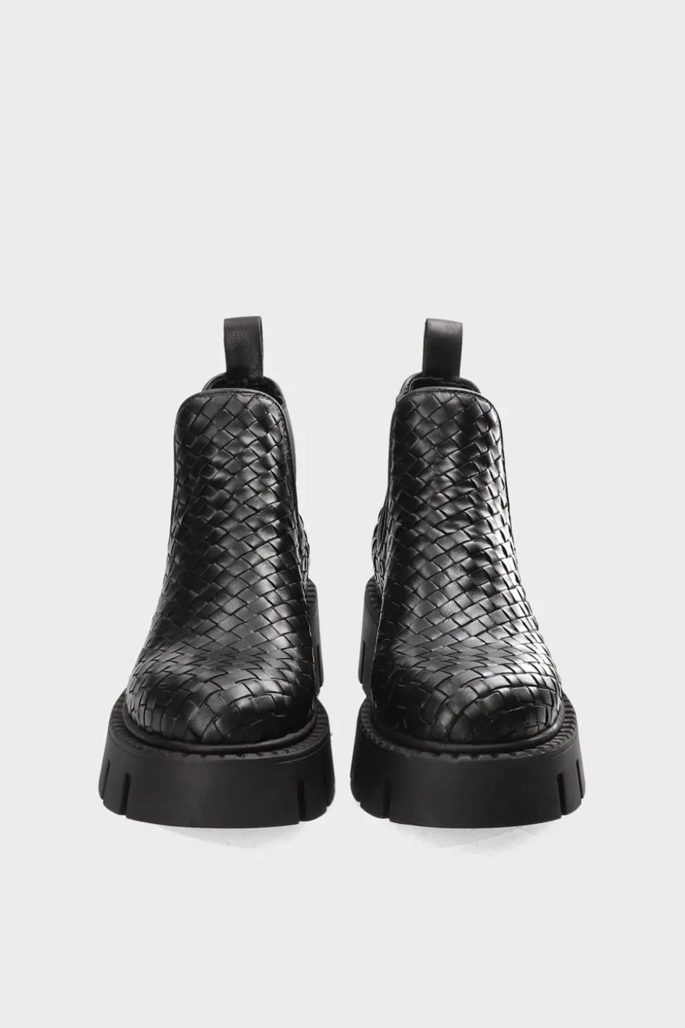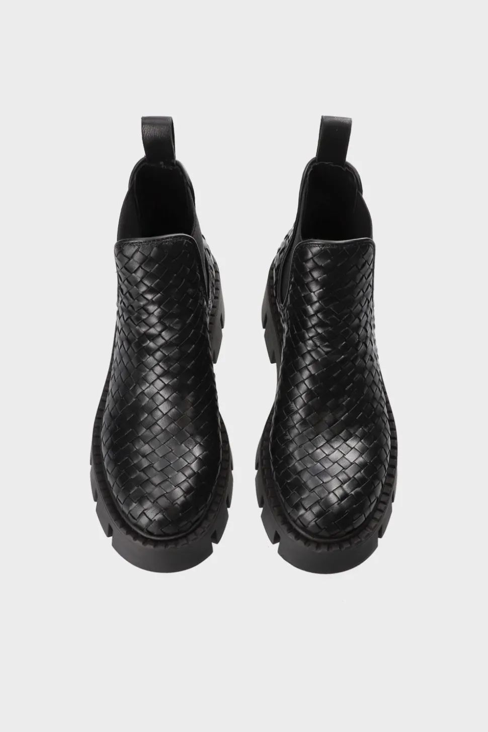 In Het Zwart. Lage Chelsea Boots Met Opvallend Gevlochten Nappaleer. Grof Silhouet. Trek Het Lusje Aan De Achterkant. Elastische Zijpanelen. Ronde Neus. Robuuste Rubberen Plateauzool Met Blokhak En Opvallend Profiel.Onze Schoenen Zijn Ontworpen In Kopenhagen En Gemaakt In Europa. Het Leer Is Afkomstig Van Geselecteerde, Door Een Familie Gerunde Fabrieken In Italië.