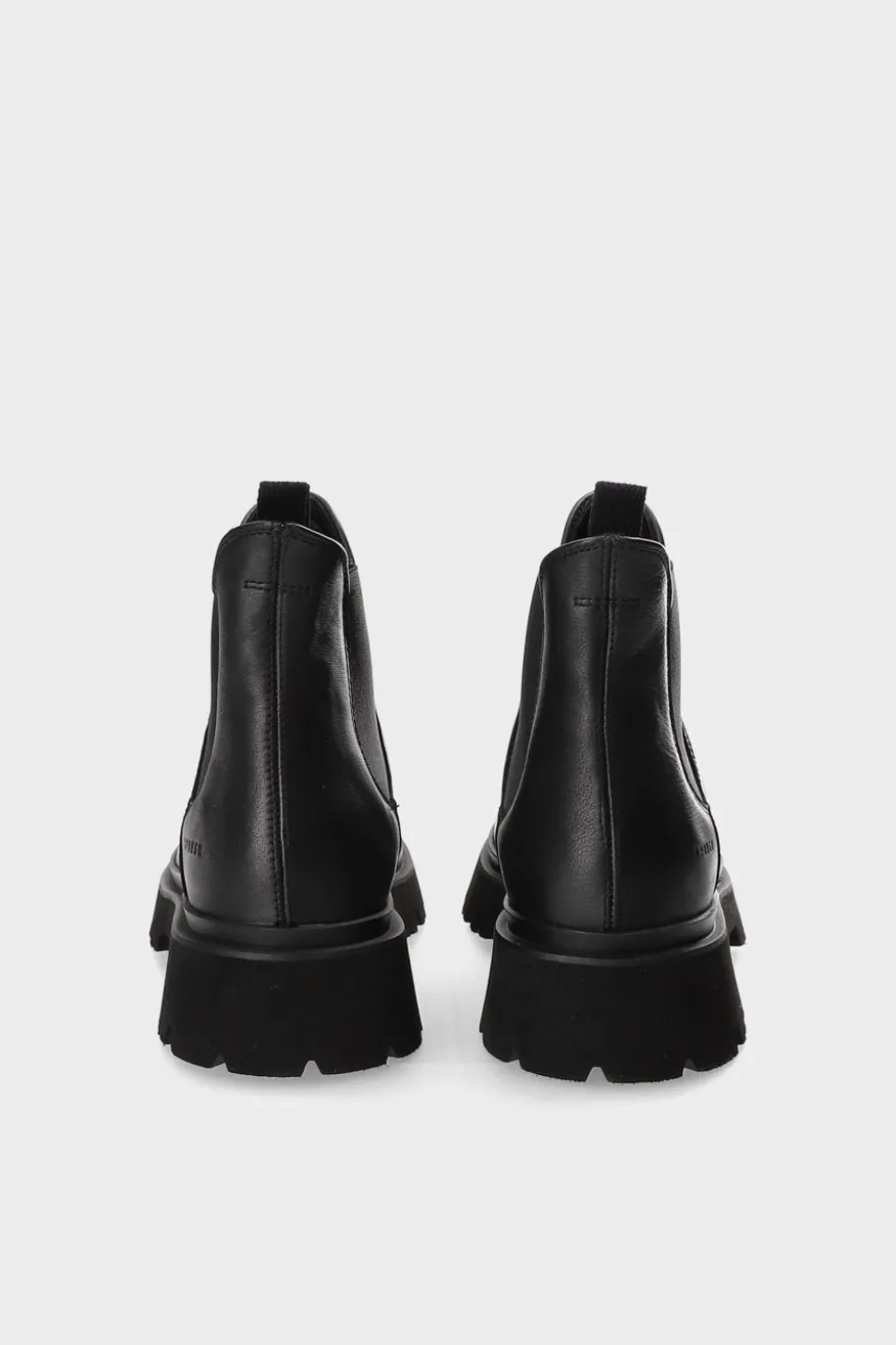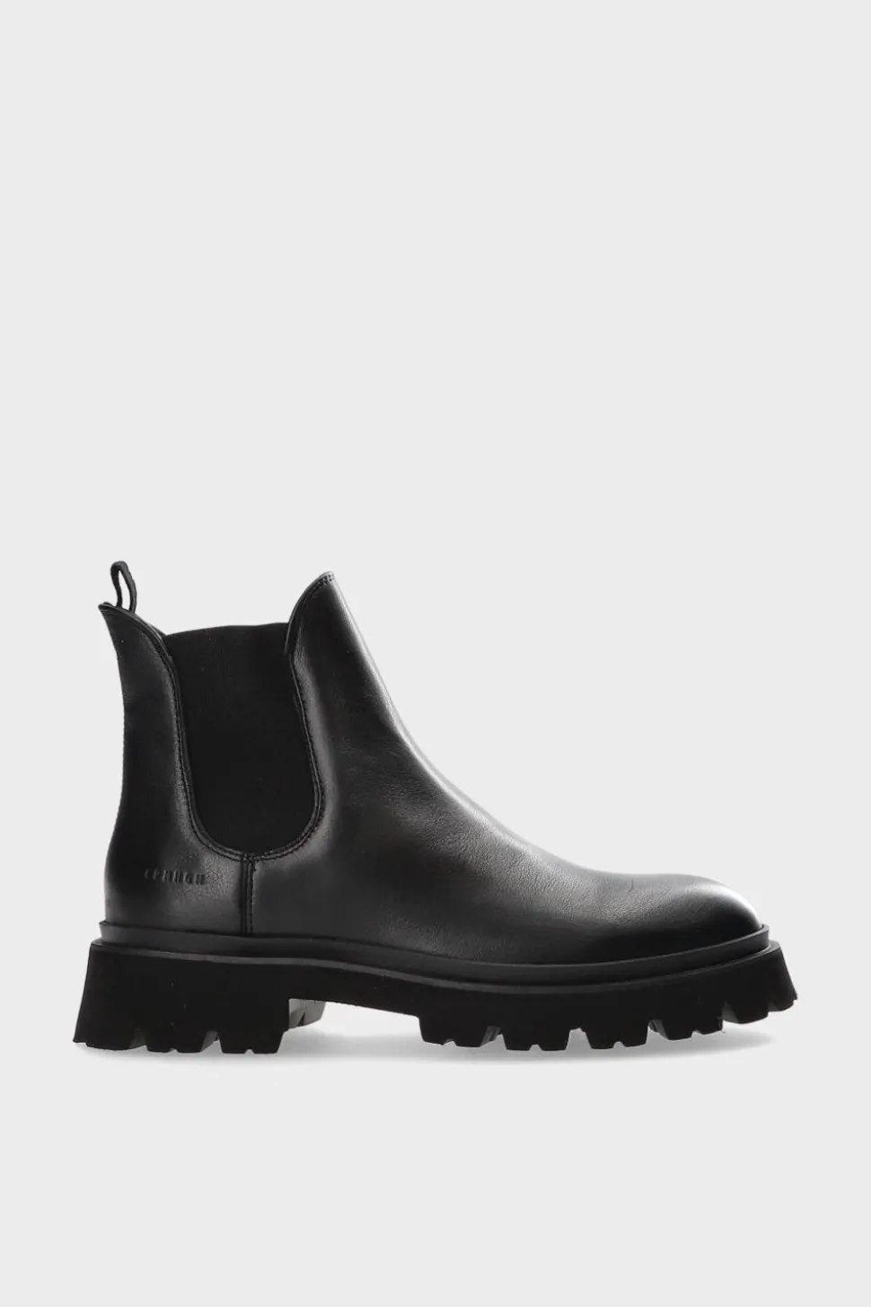 In Het Zwart. Lage Chelsea Boots Gemaakt Van Glad Leer. Minimalistisch Silhouet Met Dikke Elementen. Elastische Zijpanelen. Geborduurde Details. Trek Het Lusje Aan De Achterkant. Iets Taps Toelopend Teengedeelte. Dikke Rubberen Zool Met Dik Loopvlak, Blokhak En Spatbord. Minimalistische Chelsea Boots Met Opvallende Elementen.Materiaal