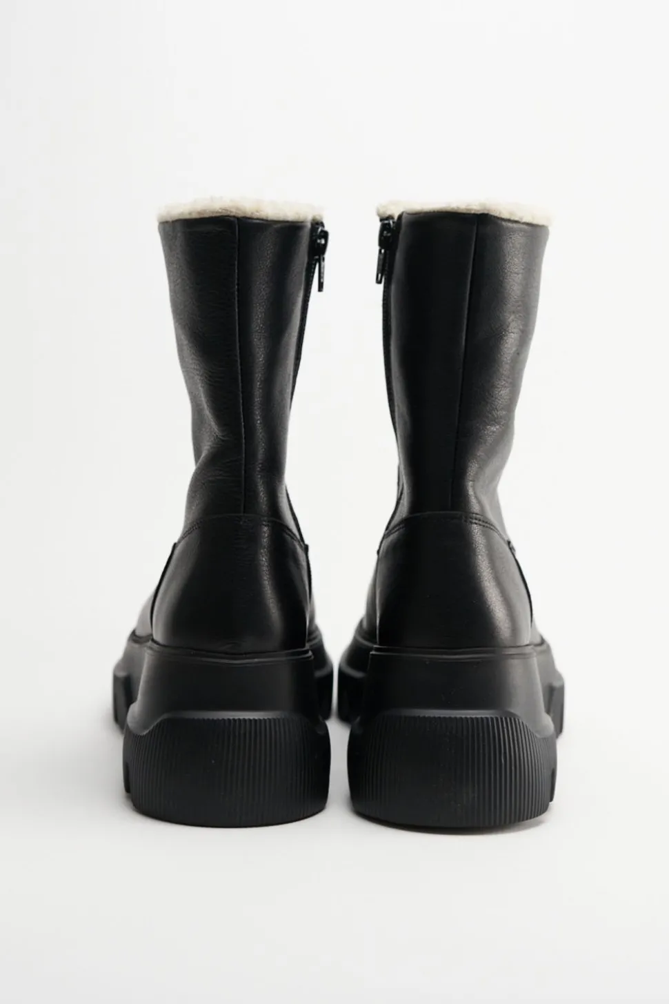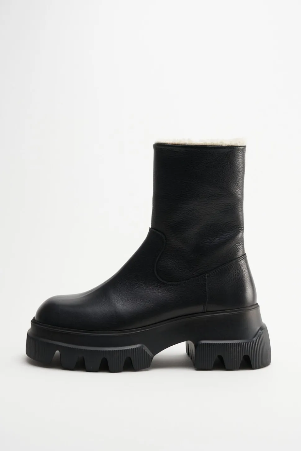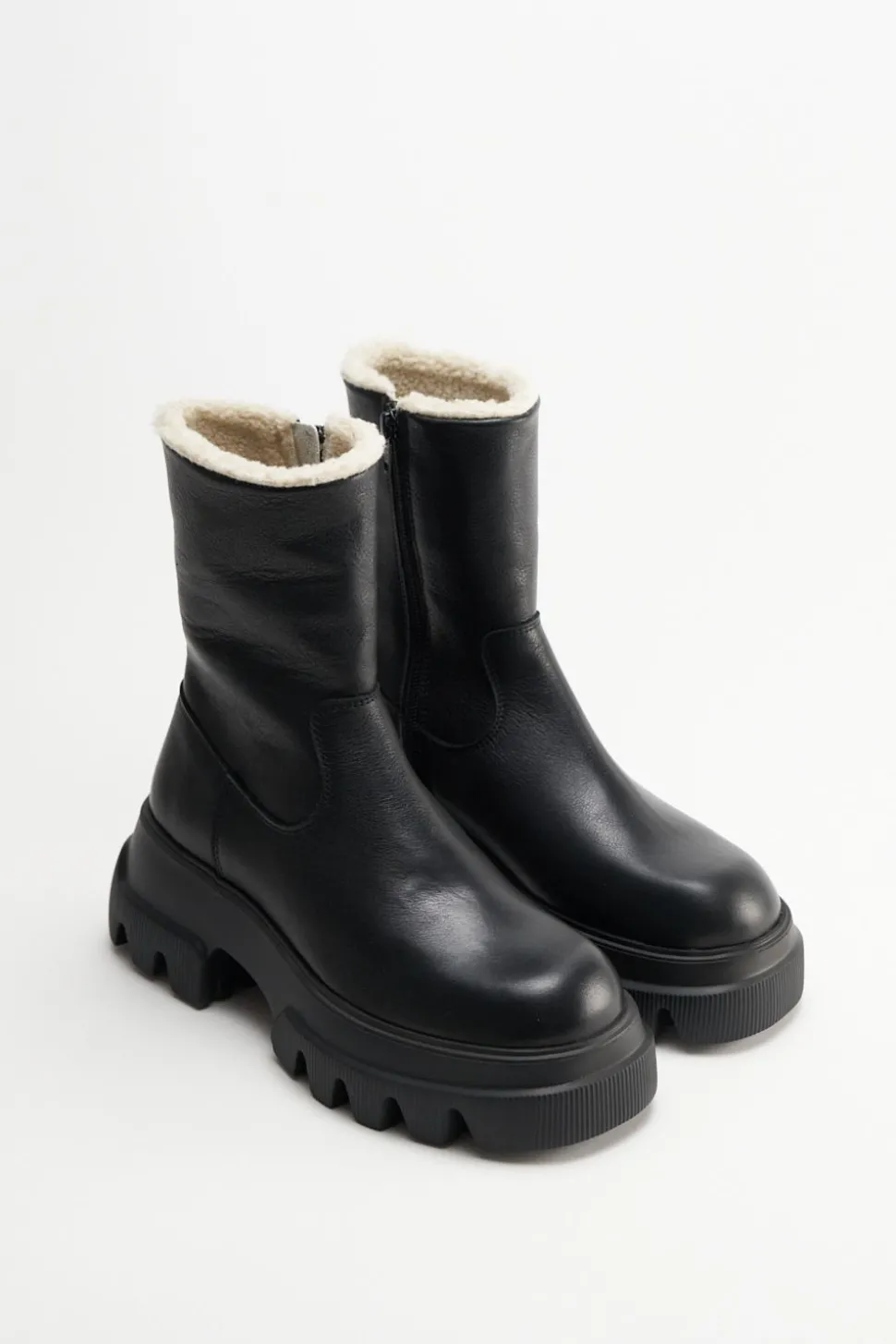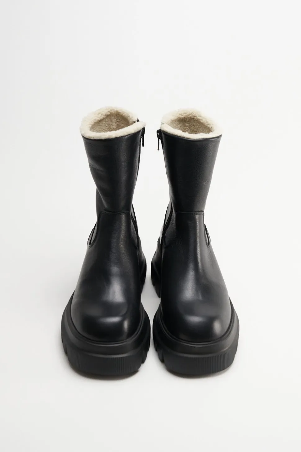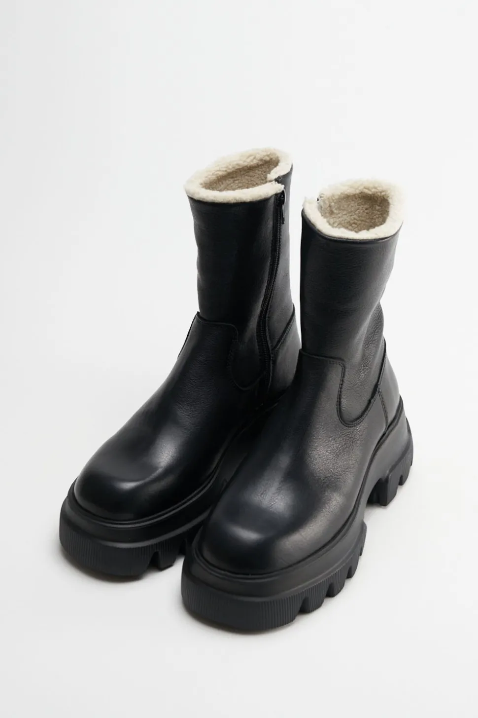 In Het Zwart. Enkellaarzen Gemaakt Van Glad Leer Met Vegan Teddy Voering. Grof Silhouet. Iets Vierkante Dop. Rits Aan De Binnenkant. Tonale Hardware. Contrasterende Elementen En Geborduurde Details. Een Relaxte Stijl Voor Koude Dagen.Onze Schoenen Zijn Ontworpen In Kopenhagen En Gemaakt In Europa. Het Leer Komt Uit Geselecteerde Familiebedrijven In Italië.