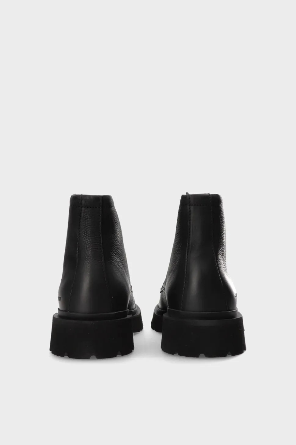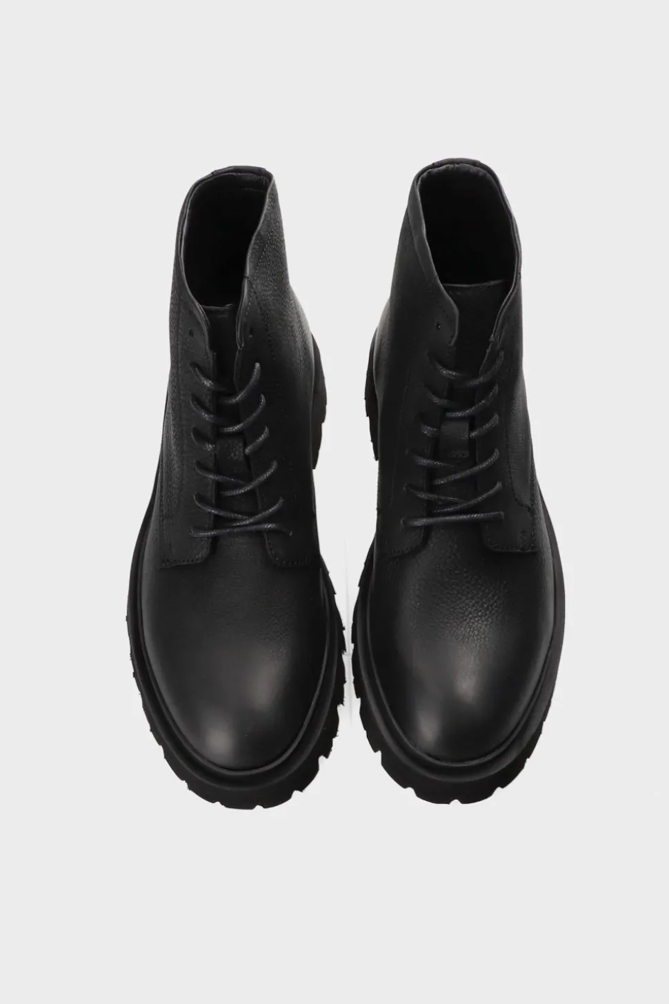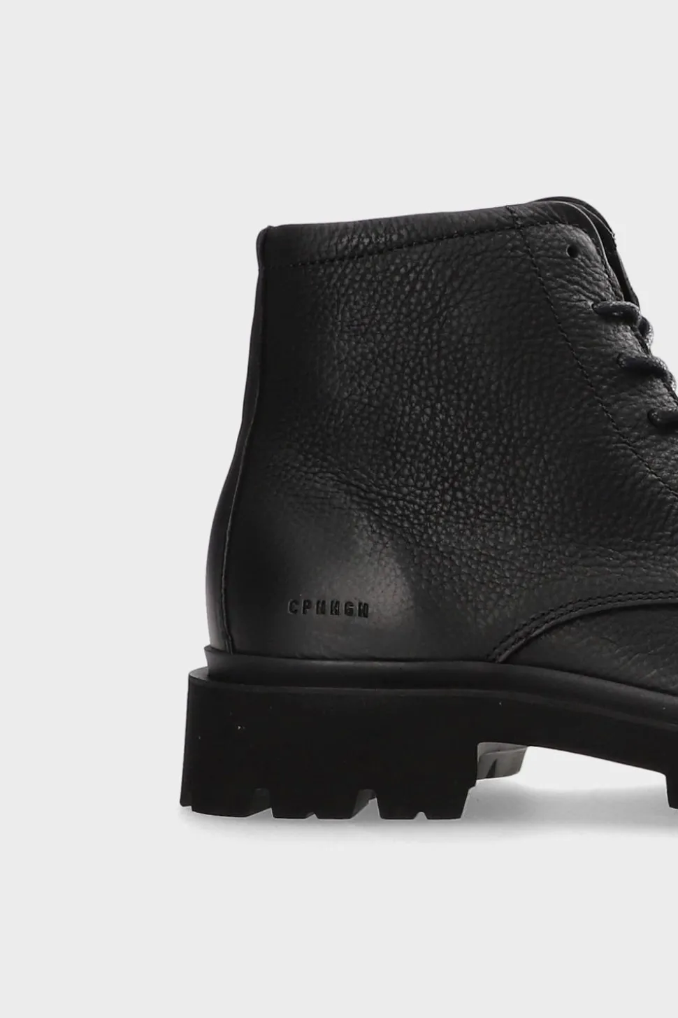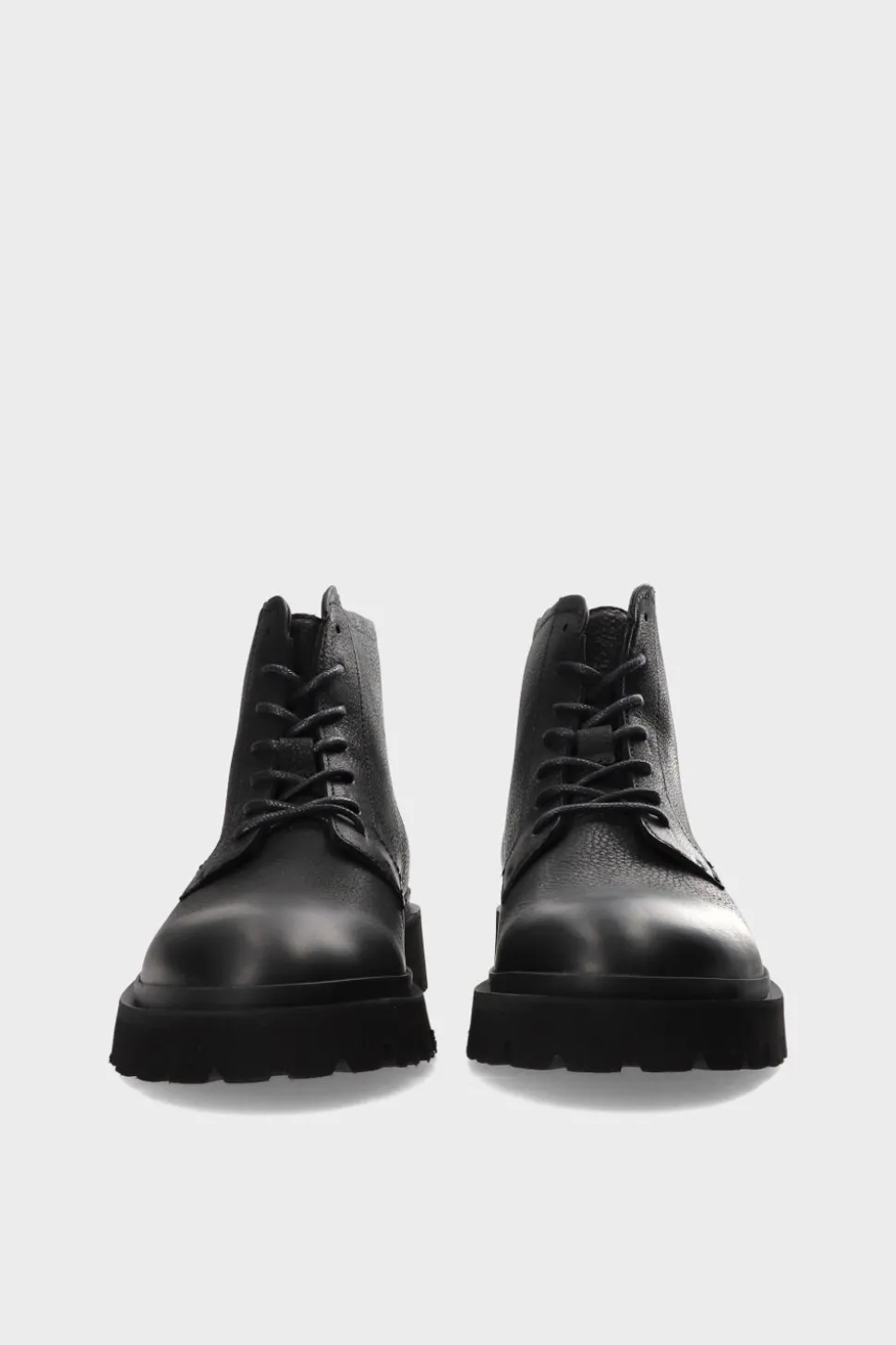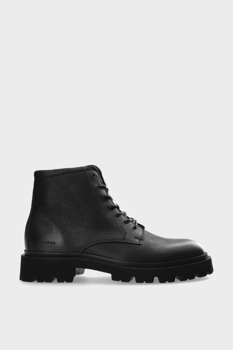 In Het Zwart. Enkelhoge Veterschoenen Van Generfd Leer. Gevechtssilhouet. Afzonderlijke Elementen. Geborduurde Details. Logo Aan De Buitenkant. Vetersluiting Aan De Voorkant. Ronde Neus. Robuuste Rubberen Zool Met Grof Profiel, Blokhak En Spatbord. Een Expressieve Stijl Voor Koele Winterdagen.Onze Schoenen Zijn Ontworpen In Kopenhagen En Gemaakt In Europa. Het Leer Is Afkomstig Van Geselecteerde, Door Een Familie Gerunde Fabrieken In Italië.