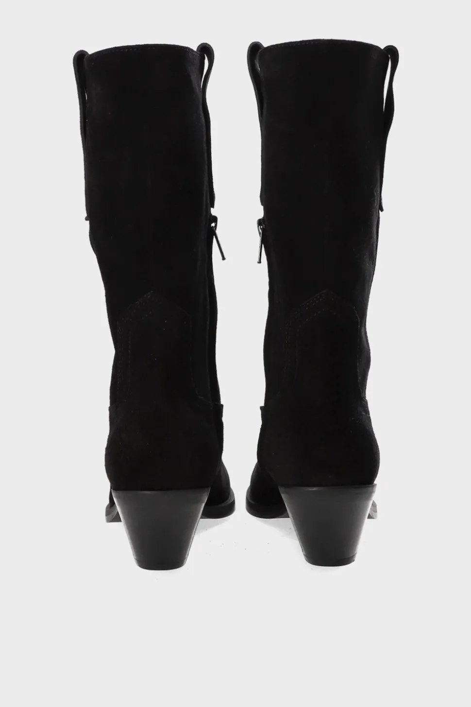 In Het Zwart. Middelhoge Texano Enkellaarzen Gemaakt Van Suède. Slank Silhouet. Brede Schacht. Contrasterende Elementen Met Geborduurde Details. Rits Aan De Binnenkant. Kleurcontrasterende Binnenvoering. Treklussen Aan De Zijkant. Rechthoekig Gevormd, Spitse Neus. Gladde Zool Met Schuine Blokhak. Elegante Enkellaarsjes In Texano-Stijl.Onze Schoenen Zijn Ontworpen In Kopenhagen En Gemaakt In Europa. Het Leer Is Afkomstig Van Geselecteerde, Door Een Familie Gerunde Fabrieken In Italië.