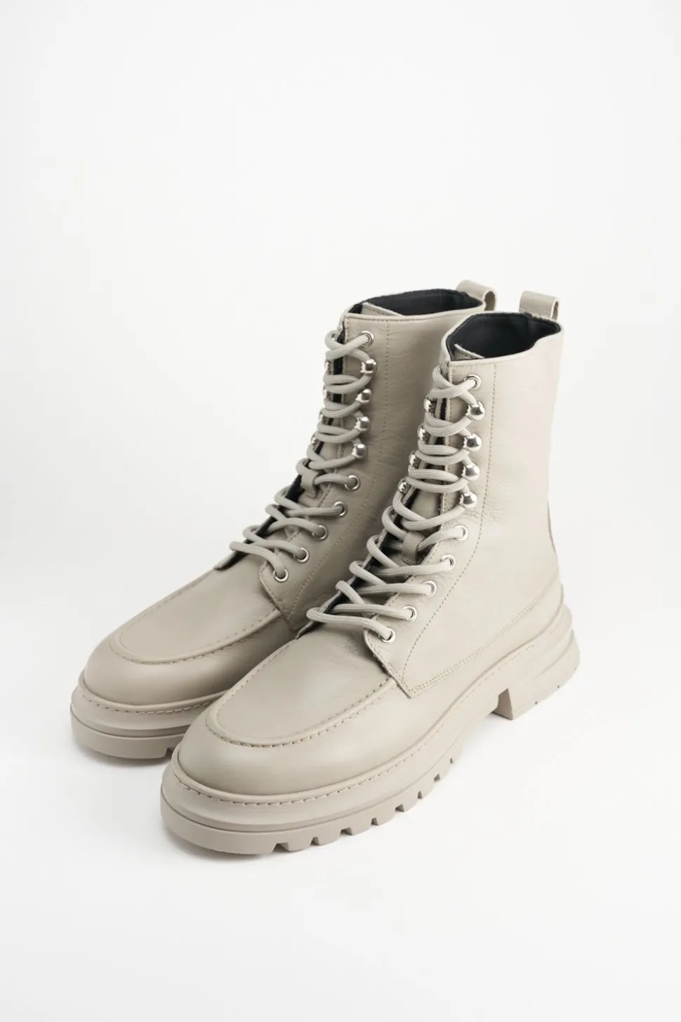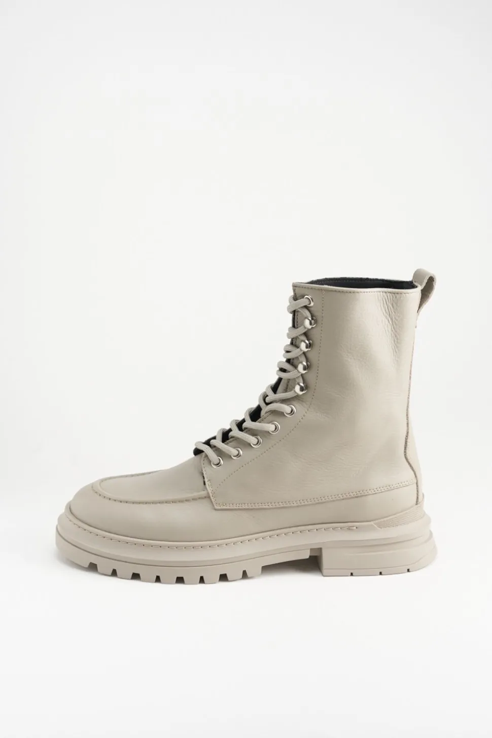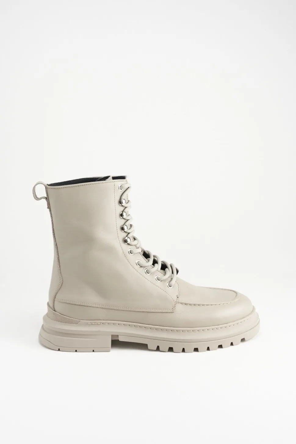 In Greige. Veterlaarzen Gemaakt Van Glad Leer Met Een Matte Afwerking. Enkelhoog Silhouet. Afgeronde Dop. Mocassinelementen En Geborduurde Details. Zilverkleurige Oogjes En Haken. Tonale Veters. Trek De Lus Aan De Schacht. Verrassende Details Ontmoeten Alledaags Comfort.Onze Schoenen Zijn Ontworpen In Kopenhagen En Gemaakt In Europa. Het Leer Komt Uit Geselecteerde, Door Een Familie Gerunde Fabrieken In Italië.