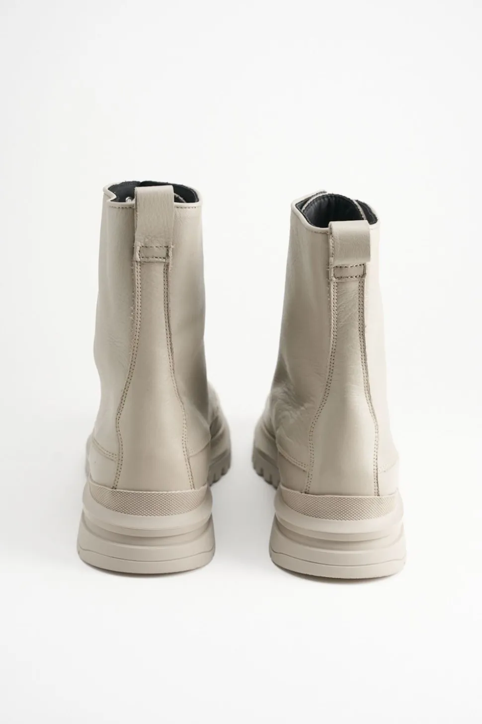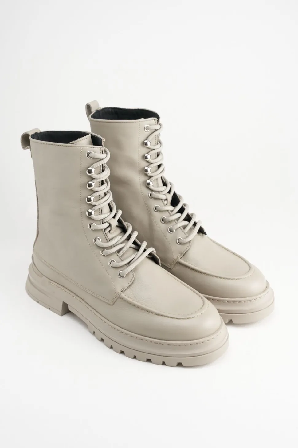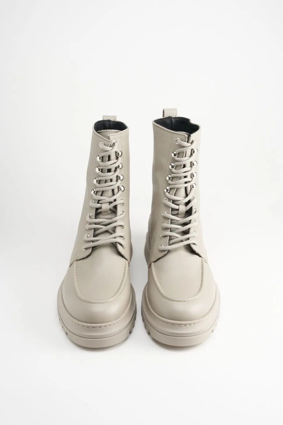 In Greige. Veterlaarzen Gemaakt Van Glad Leer Met Een Matte Afwerking. Enkelhoog Silhouet. Afgeronde Dop. Mocassinelementen En Geborduurde Details. Zilverkleurige Oogjes En Haken. Tonale Veters. Trek De Lus Aan De Schacht. Verrassende Details Ontmoeten Alledaags Comfort.Onze Schoenen Zijn Ontworpen In Kopenhagen En Gemaakt In Europa. Het Leer Komt Uit Geselecteerde, Door Een Familie Gerunde Fabrieken In Italië.